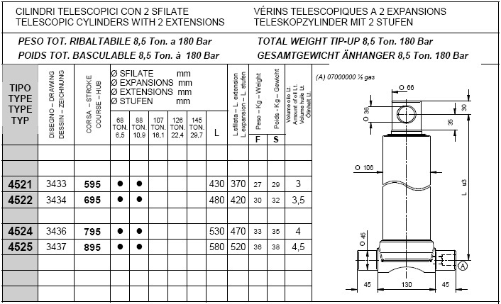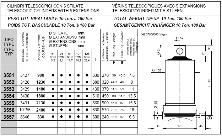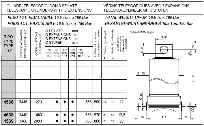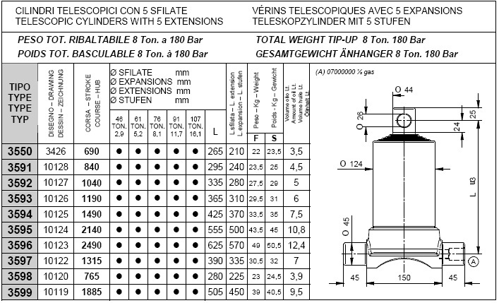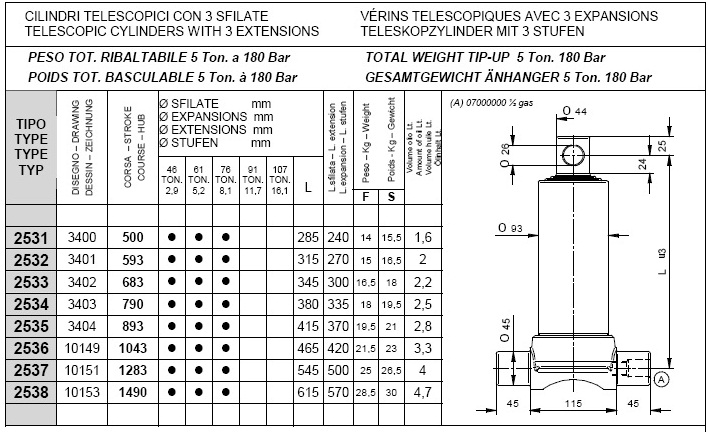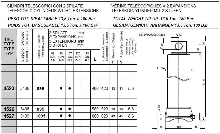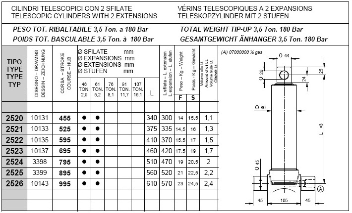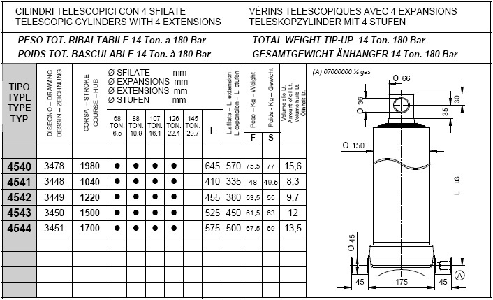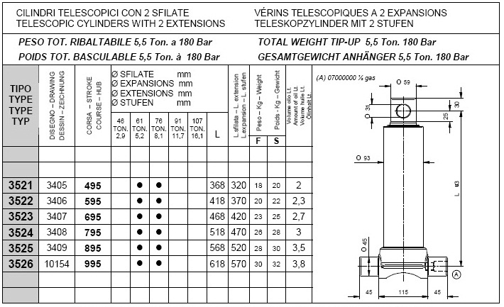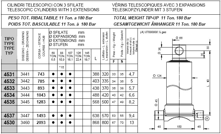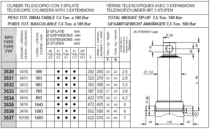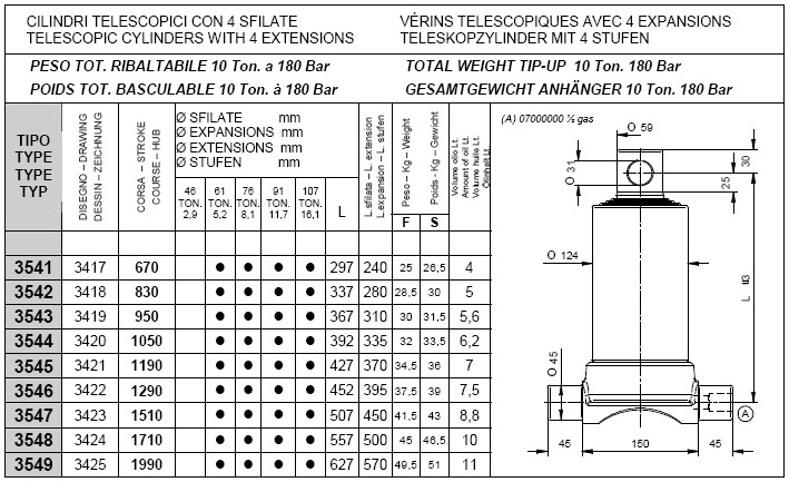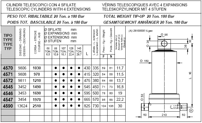 Pod kategorijami posameznih stopenj kliknite na željeno nosilnost teleskopskega cilindra in si oglejte vgadne mere cilindrov (prvi stolpec prikazuje tip cilindra, tretji stolpec "stroke" pa delovni hod posameznega cilindra, ostali parametri so razvidni iz priloženega načrta.).
