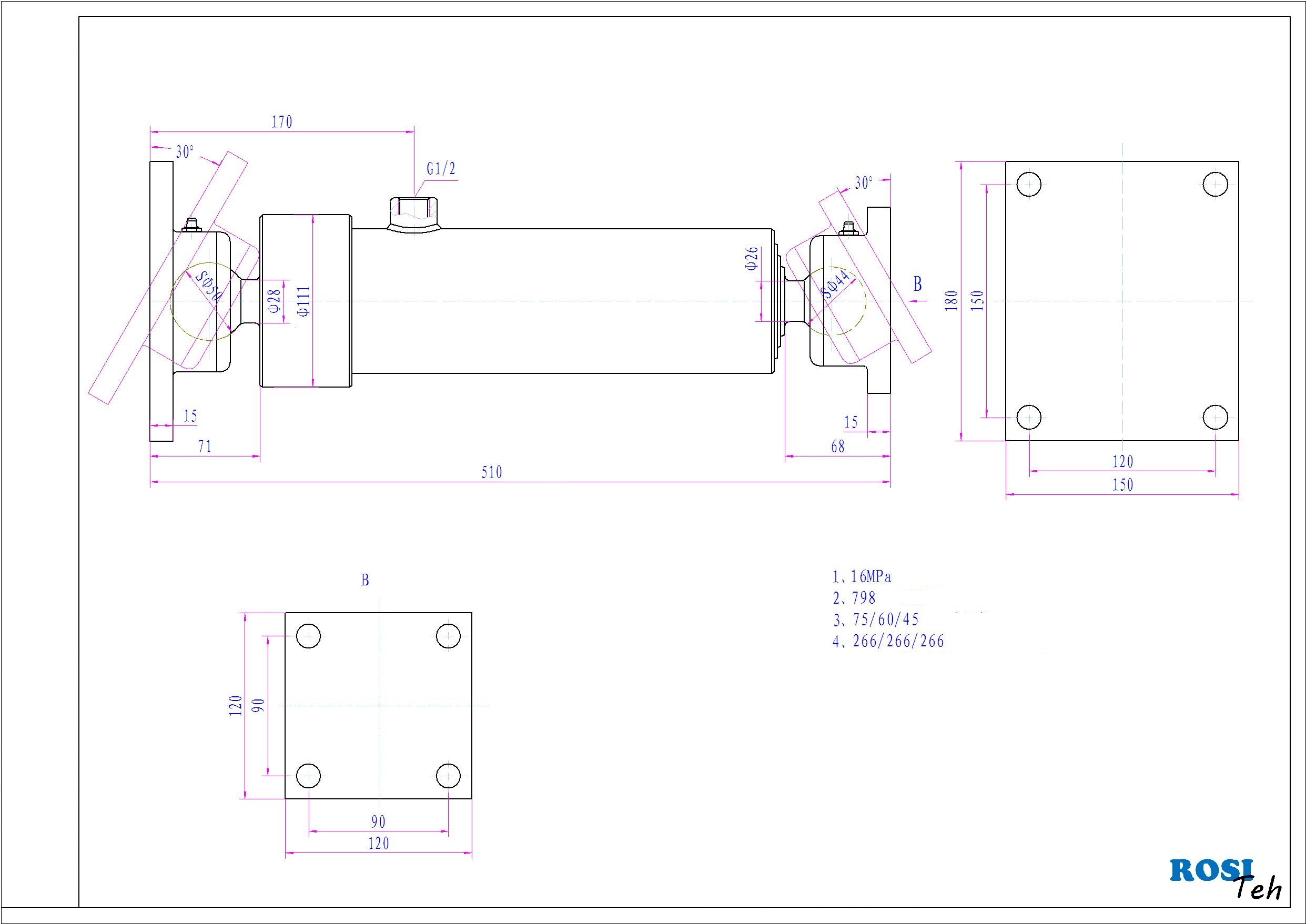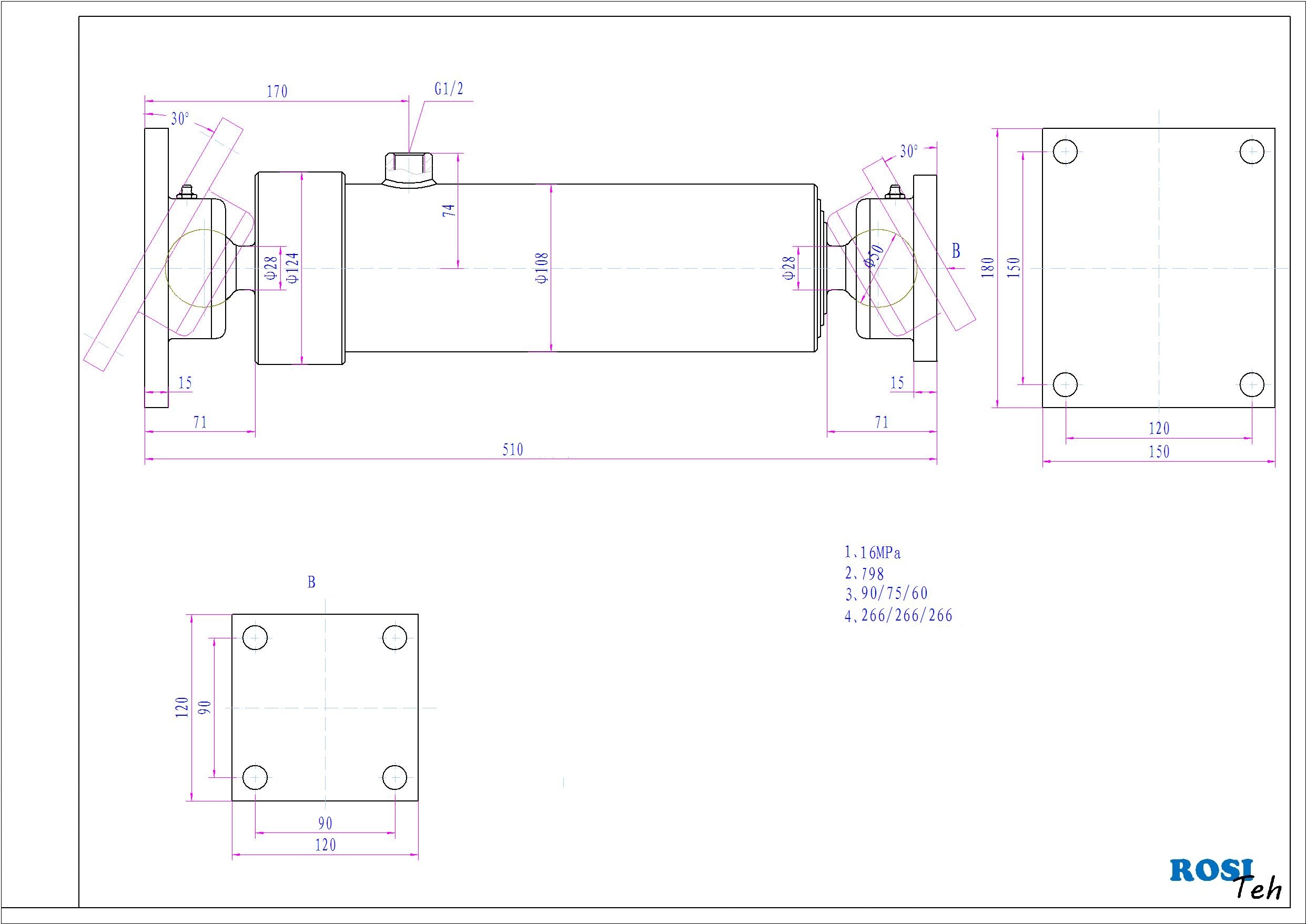 3 - stopenjski kiper cilinder z montažno ploščo na obeh straneh